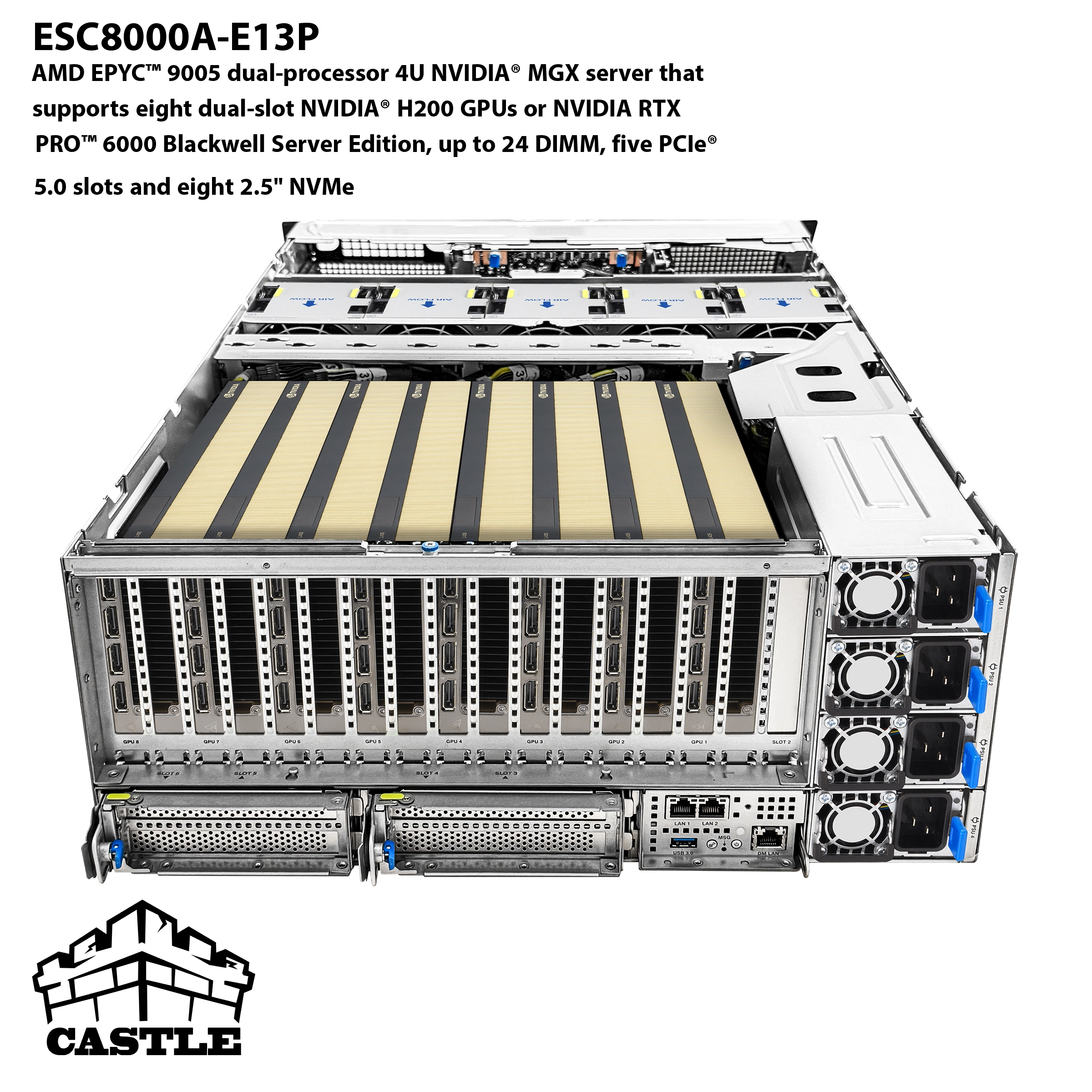 - ۸ اسلات PCIe 5.0 x16 برای کارتهای گرافیک دو اسلاتی NVIDIA® H200 GPUs or NVIDIA RTX PRO™ 6000 Blackwell Server Edition