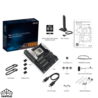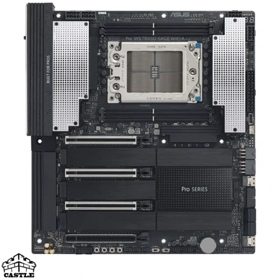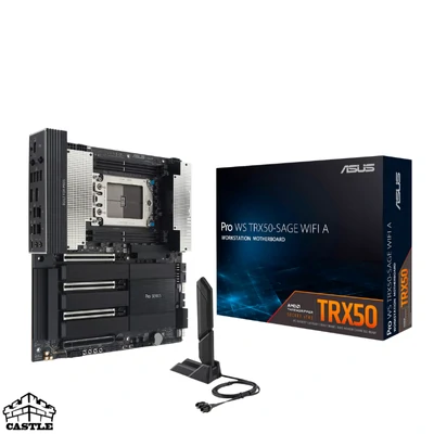 مادربرد ASUS Pro WS TRX50 SAGE WIFI-A پرچمدار مادربردهای ورکاستیشن ایسوس است که برای حرفهایترین کاربران و مراکز تولید محتوا طراحی شده است. این مادربرد با سوکت sTR5 و چیپست AMD TRX50 از پردازندههای قدرتمند AMD Ryzen Threadripper 7000 Series پشتیبانی میکند و قابلیت نصب حافظههای DDR5 با ظرفیت بالا و پهنای باند عظیم را دارد.