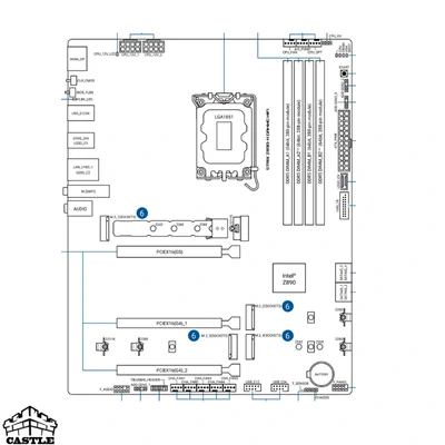 - چهار اسلات حافظه DDR5 با پشتیبانی تا 192 گیگابایت و فرکانس 8400+ MHz (OC)