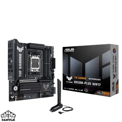 ASUS TUF GAMING B850M-PLUS WIFI7 یکی از جدیدترین مادربردهای سری TUF ایسوس برای پردازندههای نسل Ryzen 7000، 8000 و 9000 است. این مادربرد با چیپست AMD B850 و سوکت AM5 طراحی شده و از حافظههای DDR5 با فرکانسهای بالا، رابط PCIe 5.0 و شبکه بیسیم نسل جدید WiFi 7 پشتیبانی میکند.