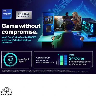 پردازنده Intel Core i9‑14900KS با ۲۴ هسته (۸ P + ۱۶ E)، فرکانس توربو تا ۶.۲ GHz و لیتوگرافی Intel 7، قدرتمندترین تراشه مصرفکننده اینتل است و بالاترین سرعت کلاک در کلاس دسکتاپ را ارائه میدهد.